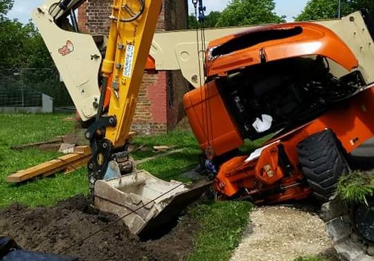 18 Feb Utilising a 14ton excavator as a lifting frame for the sunken 17ton cherry picker lifted by a mere landrover winch